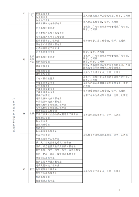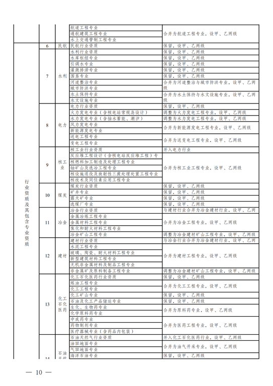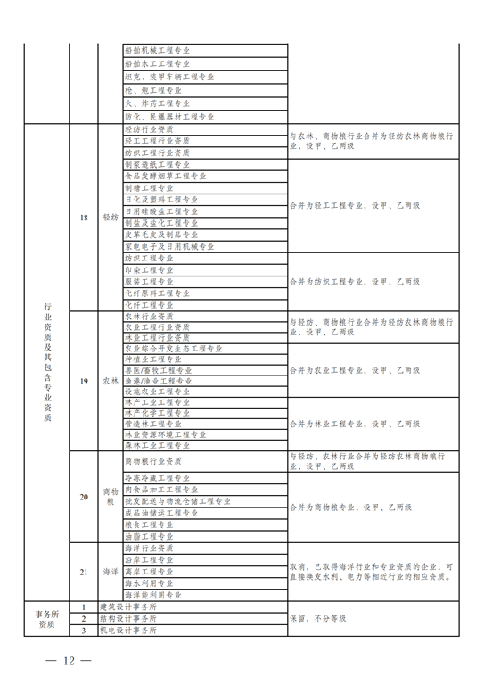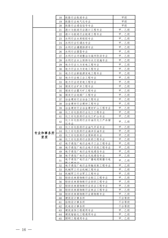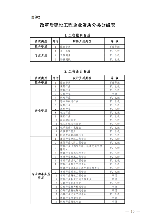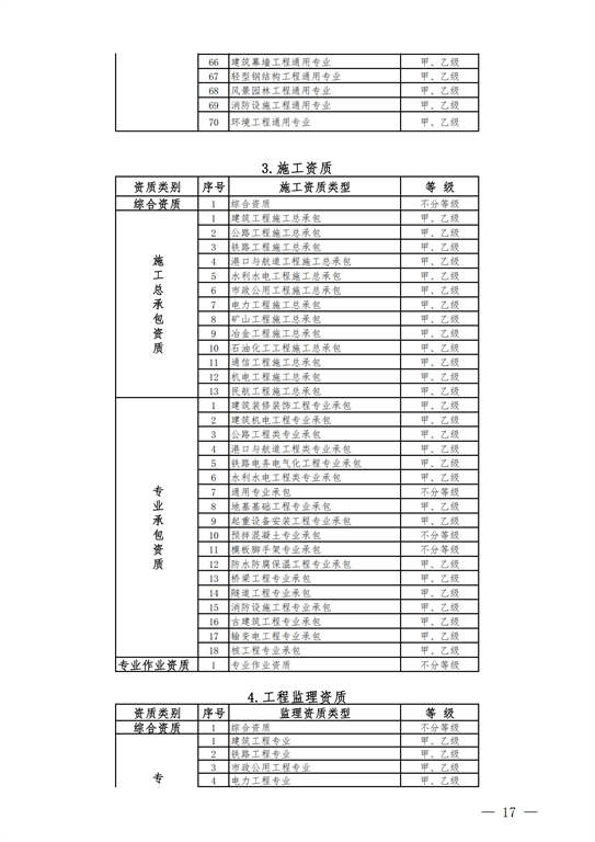 2.工程設(shè)計(jì)資質(zhì)。保留綜合資質(zhì);將21類(lèi)行業(yè)資質(zhì)整合為14類(lèi)行業(yè)資質(zhì);將151類(lèi)專(zhuān)業(yè)資質(zhì)、8類(lèi)專(zhuān)項(xiàng)資質(zhì)、3類(lèi)事務(wù)所資質(zhì)整合為70類(lèi)專(zhuān)業(yè)和事務(wù)所資質(zhì)。綜合資質(zhì)、事務(wù)所資質(zhì)不分等級(jí);行業(yè)資質(zhì)、專(zhuān)業(yè)資質(zhì)等級(jí)原則上壓減為甲、乙兩級(jí)(部分資質(zhì)只設(shè)甲級(jí))。